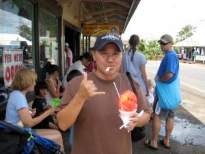 It is often debated. “Who has the best shave ice?” Well, I was given the opportunity to find out first-hand this past Friday. Our Kamehameha Schools ESS division had its nohona cultural activity in Hale’iwa. The 90 of us stood in line at Matsumoto’s. After standing in the sun for a few minutes, I realized that I could go to Aoki’s and have a shave ice while waiting in the long Matsumoto’s line. No, I’m not a pig. I did this for the sake of research…. Anyway, I first had the Aoki’s shave ice. It was great! In fact, the locals prefer Aoki’s over Matsumoto’s. Then, I got my Matsumoto’s shave ice. Woh. There was a difference. I actually liked the Matsumoto’s a lot better. Funny, but it seemed a lot “colder.” I liked the ice better (must be the water,) and the texture (must be the blades,) and it melted slower (they must refrigerate their syrup.) They were both great, but IMHO, Matsumoto’s wins. Now this is not an exact science. I will need to replicate this experiment a few more times….